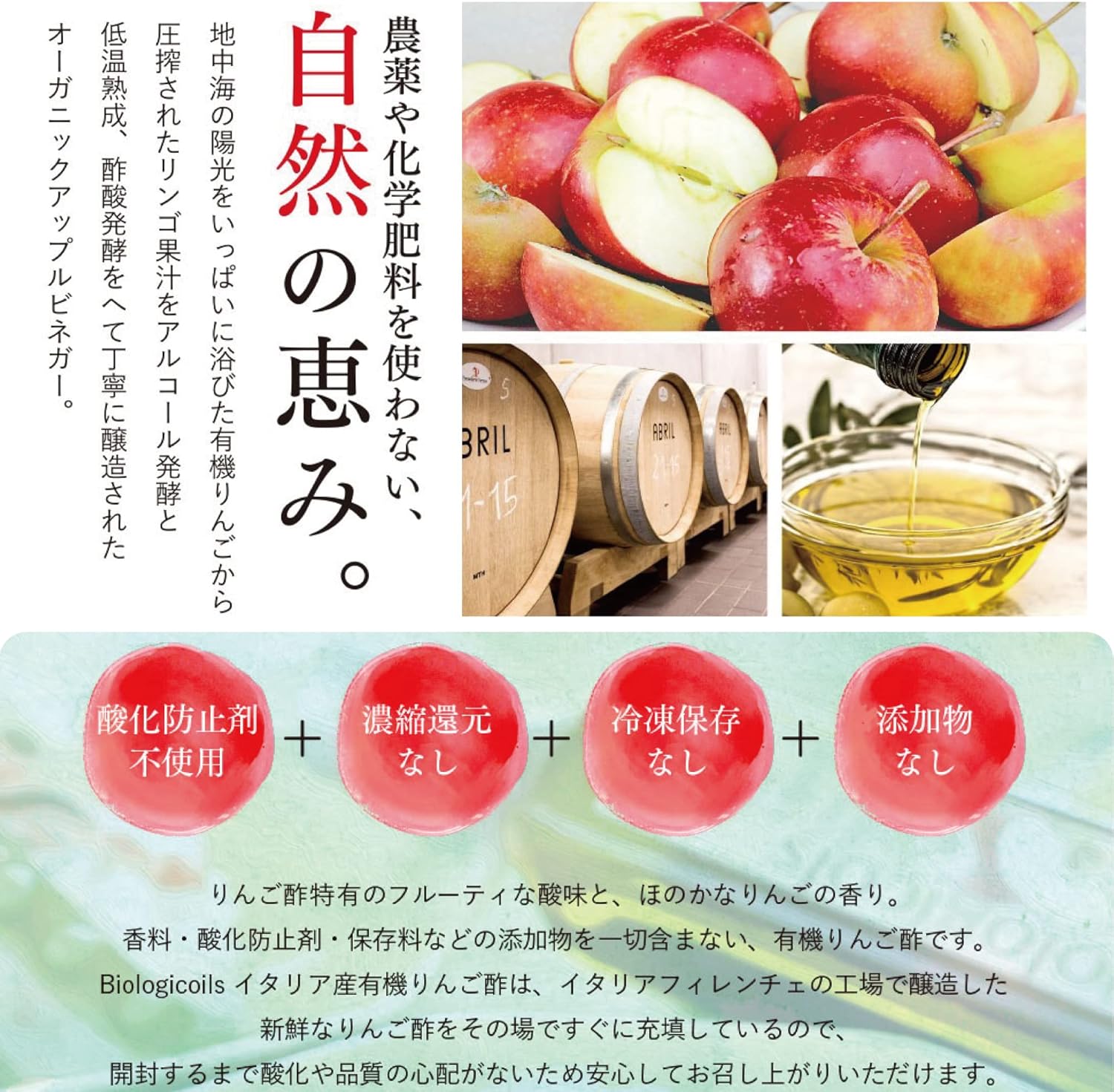 100%イタリア産の有機栽培されたオーガニックリンゴから圧搾されたリンゴ果汁をアルコール発酵と低温熟成、酢酸発酵をへて丁寧に醸造された有機JAS認証のオーガニックアップルビネガーになります。りんご酢特有のフルーティな酸っぱさとほのかなりんごの香りのあるテイストです。香料・酸化防止剤・保存料なのどの添加物を一切含まない、最高品質の有機りんご酢です。