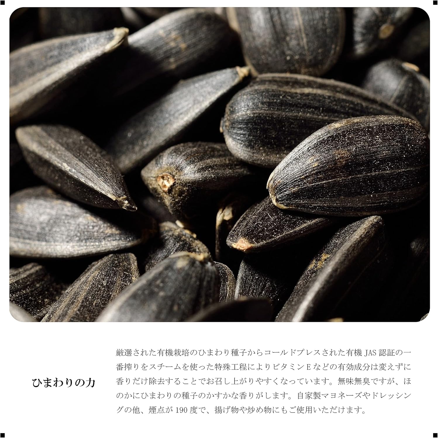 イタリア産の厳選された有機栽培のひまわり種子からコールドプレス(低温圧搾)された一番搾りオーガニックヴァージンサンフラワーオイルです。ほぼ無味無臭ですが、ほのかにひまわりの種子のかすかな香りがします。溶剤などを使用した科学的処理はしていません。有機JAS認定食品。