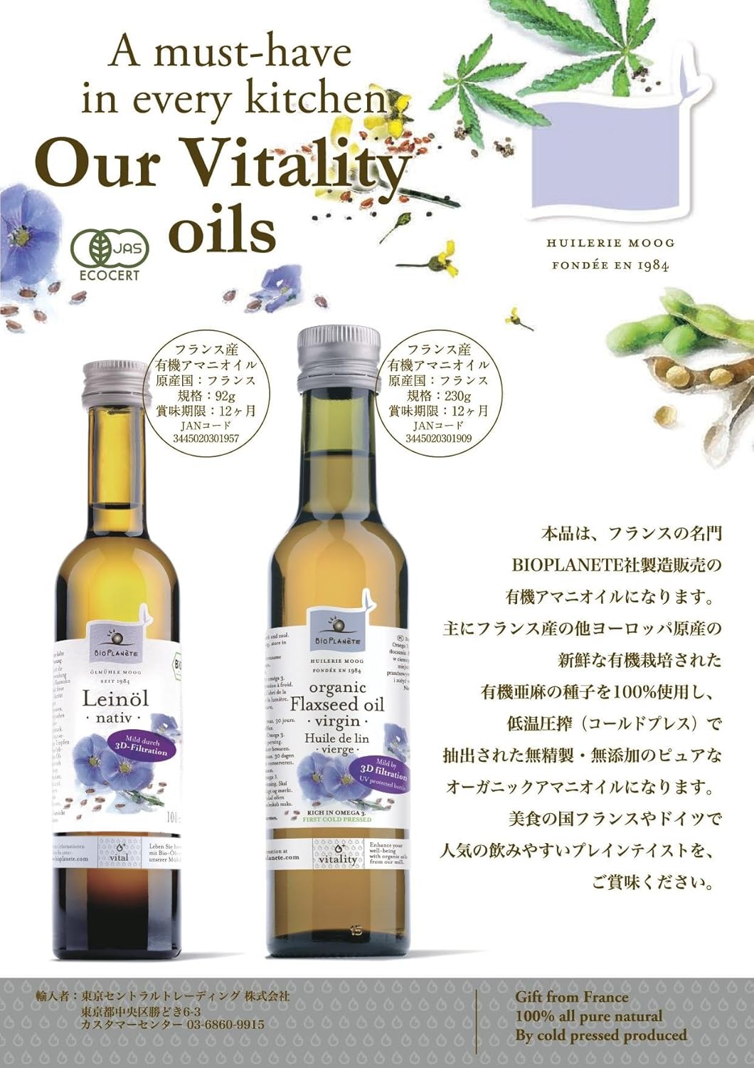 本品は主にフランス産・EU産の有機亜麻の種子でできた有機JAS認証のオーガニックフラックスオイル(有機アマニ油)になります。くせのない飲みやすいマイルドテイストです。必須脂肪酸であるオメガ3のαリノレン酸を豊富に含んでいます。伝統的な製法であるコールドプレス低温圧搾にて抽出されたまろやかで風味豊かな亜麻仁油になります。