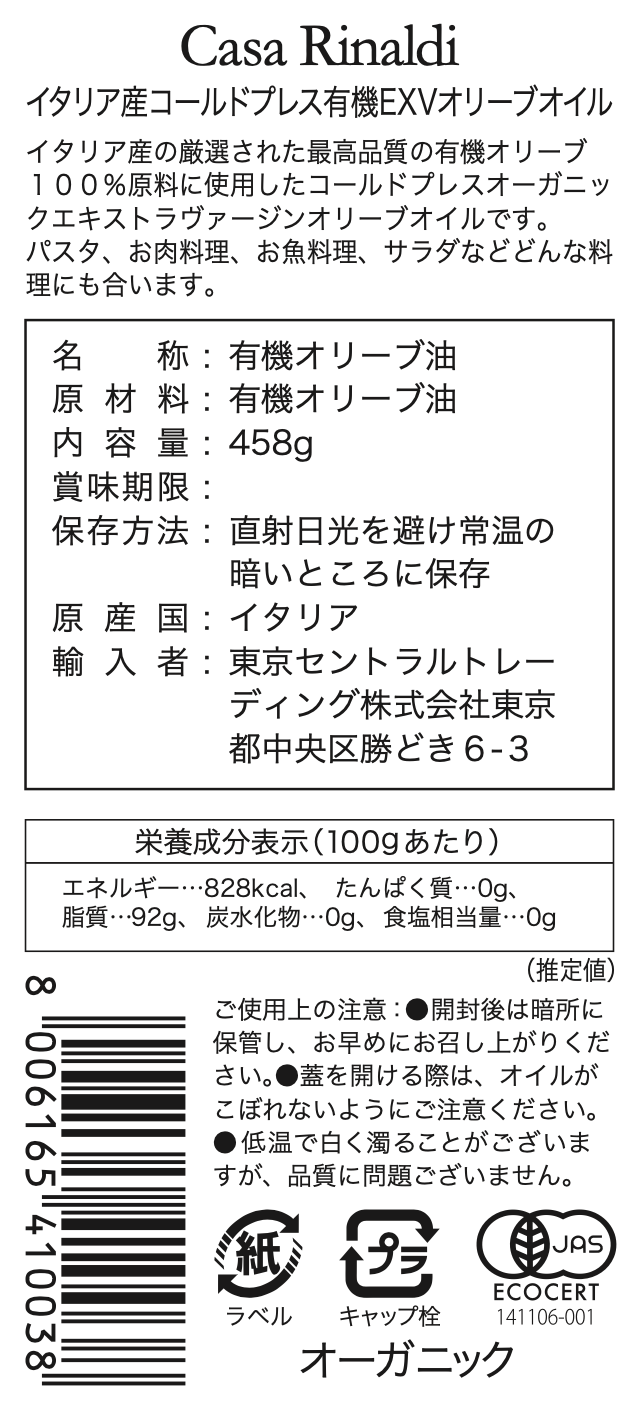 コールドプレス イタリア産有機エキストラオリーブオイル クラシコ 458g